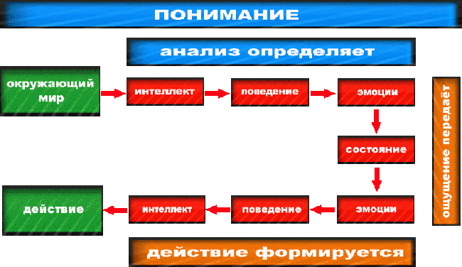 Первый шаг анализа – что сказано, цель сказанного – это область работы интеллекта. Человек на основе воспитанного объёма способностей интеллекта и уровня использования интеллекта, формирует своё понимание сказанного и своё понимание цели действия.
